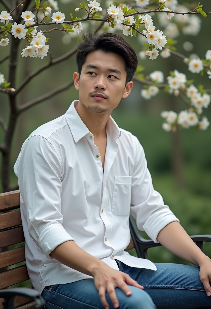 Жеңін түрген ақ көйлек пен джинсы киген ер адам бақтағы ағаш орындықта отыр. Ол жан-жағына қарап, қолымен гүлдеп тұрған ағаштың бұтағын жеңіл ұстап тұр. Артында гүлдеген бақ көрінеді. Жарық жұмсақ, екпін оның табиғилығы мен табиғатпен үйлесіміне қойылған.