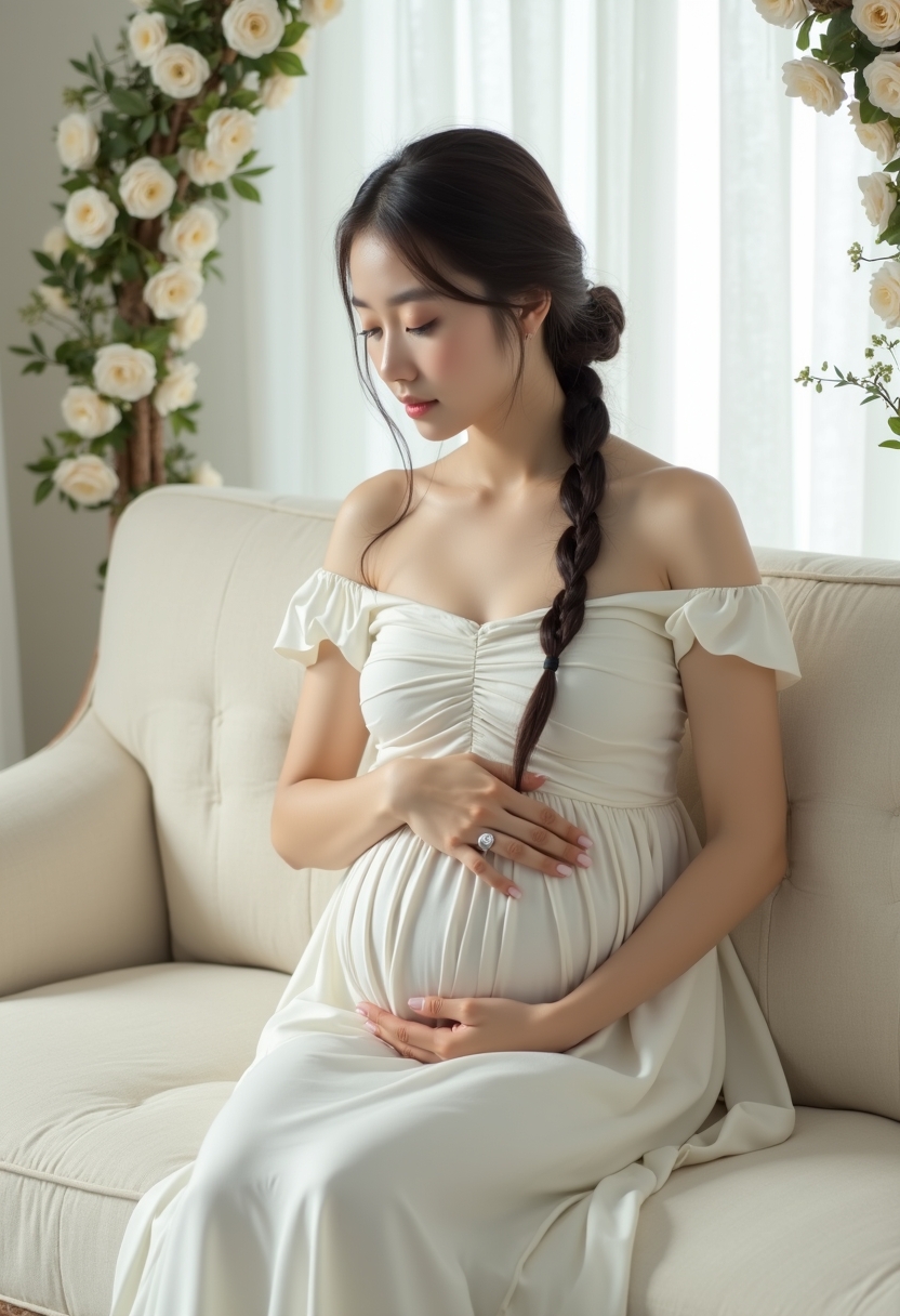 Жібек матадан тігілген ұзын ақ көйлек киген әйел жарық студиядағы жұмсақ диванда отыр. Ол бір қолымен томпайған ішін ұстап, екінші қолымен шашының бұрымын сипайды. Артында жеңіл перделер мен гүлдермен безендірілген декоративті арка көрінеді. Табиғи жарық, екпін оның нәзіктігі мен тыныштығына қойылған.