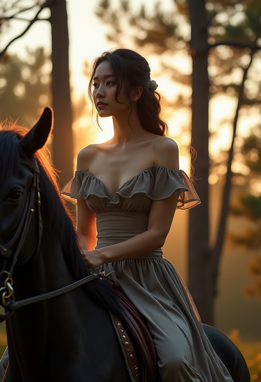 Өз бейнеңізде көруКешкі сәнді көйлек киген әйел қара атқа мініп отыр, айналада кешкі күн батуы мен ашық алқап көрінеді.