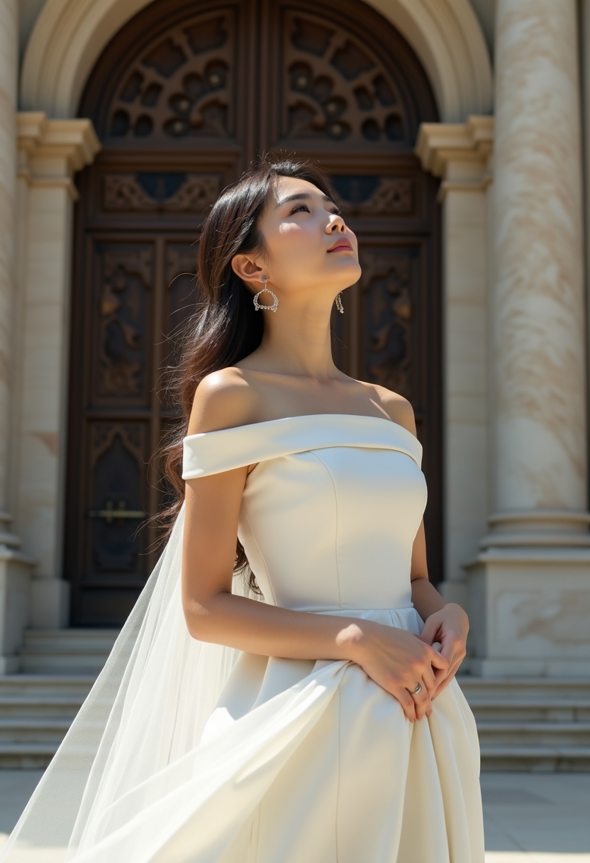 Жіңішке иықбаулы ақ көйлек киген қалыңдық ұлы собор алдында тұр, қолында фатасының ұшын ұстап тұр. Ол жоғары қарап тұр, артында үлкен ойылған есіктер мен мәрмәр бағаналар. Күн жарығы, сәттің салтанатын айқындайды.