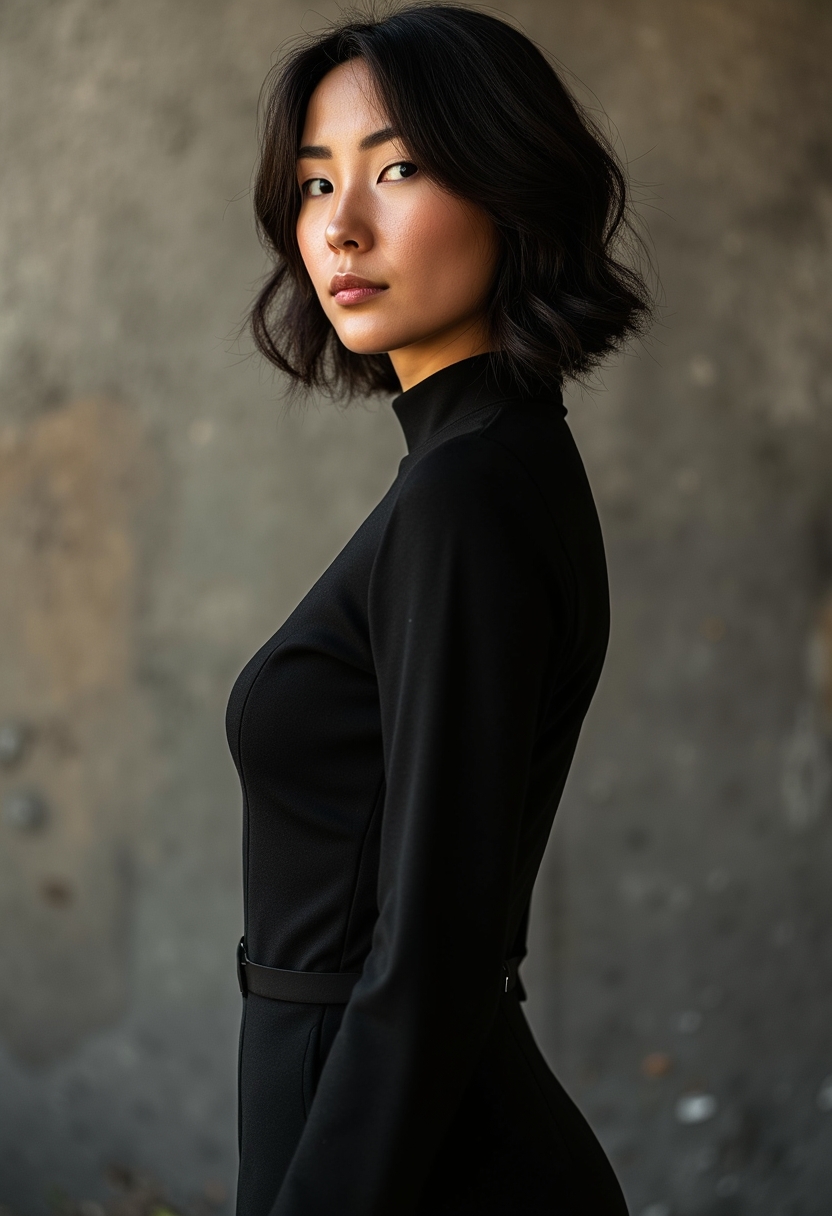 Жоғарғы жағасы бар тығыз комбинезондағы әйел абстракт фон аясында поза жасап тұр. Жарық драма әсерін күшейтеді.