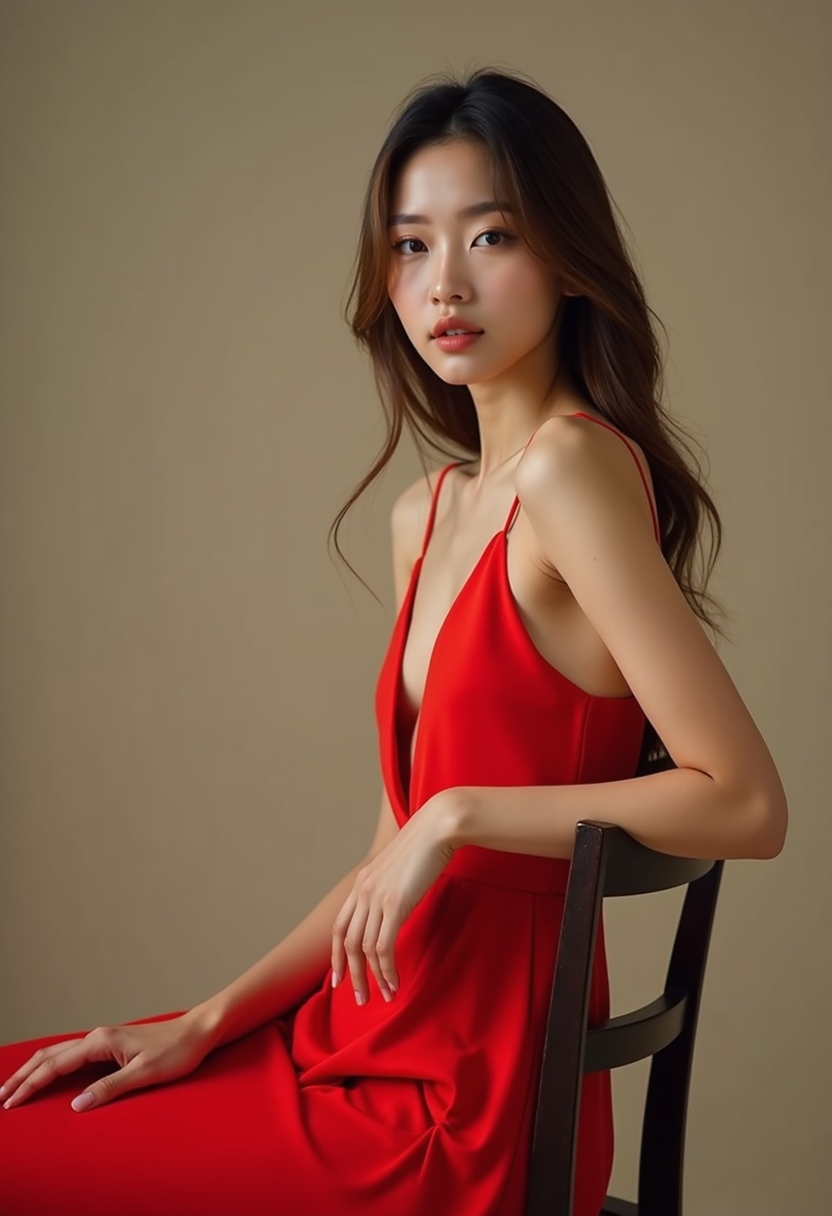 Жоғары тілігі бар ашық қызыл көйлек киген әйел орындыққа жеңіл сүйеніп тұр. Фон — градиентпен, бейтарап реңде.