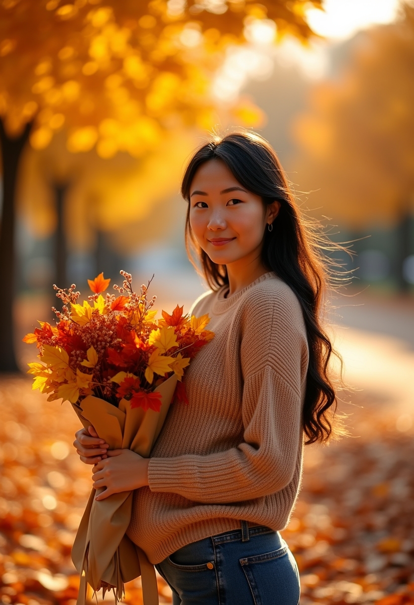 Жүкті әйел ашық түсті күзгі ағаштардың аясында тұрып, қолында алтын және қызыл жапырақтардан жасалған үлкен гүл шоғын ұстап тұр, жылы жымиып, күн сәулесі жапырақтар арасынан түсуде