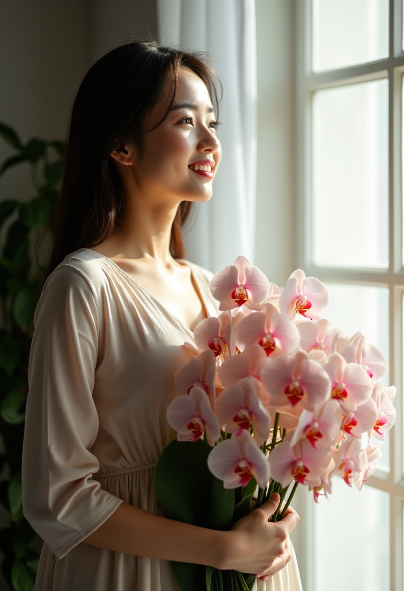 Жүкті әйел шашын тарқатып, терезеге қарап тұр, қолында үлкен орхидея гүл шоғы, күлімсіреп, терезеден түскен жарық оның бетінде жарық пен көлеңке ойынын жасайды