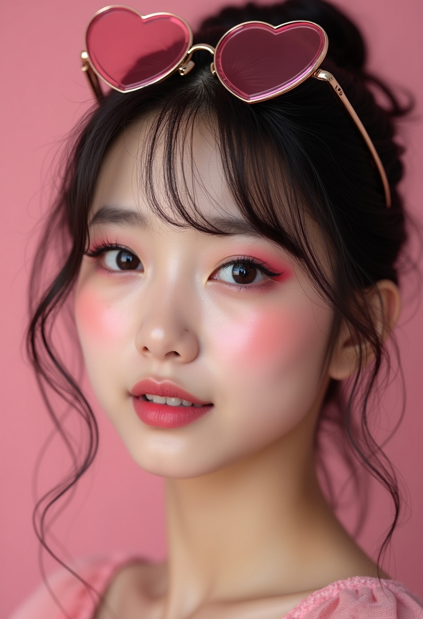 Жүрек пішінді қызғылт линзалы көзілдірік оның басына тағылған. Ол тікелей камераға қарап, сенімділік пен сүйкімділікті паш етеді. 8K ажыратымдылықтағы ультрареалистік ірі пландағы портрет: көз қабақтарындағы айқын қызғылт бояу, әсерлі қара лайнер, ұзын әрі қалың кірпіктер және жұмсақ қызғылт...