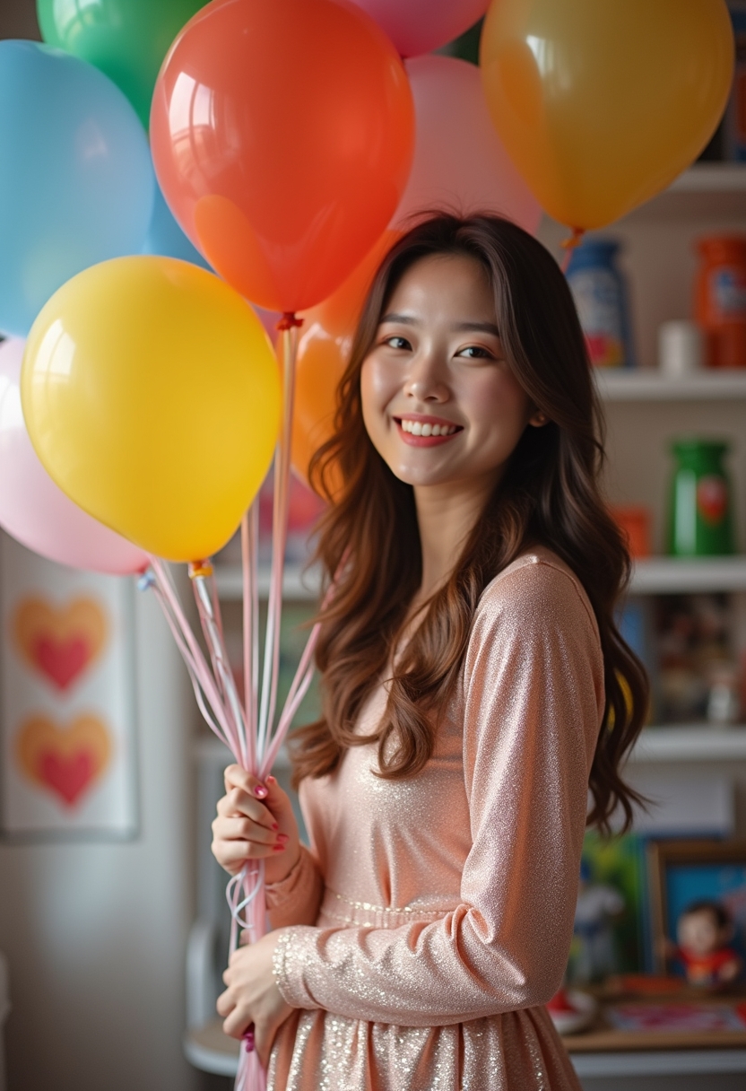 Жылтыр, ұзын жеңді көйлек киген әйел қолында түрлі-түсті шарлар байламын ұстап тұр, күлімсіреп, камераға қарайды, артында мерекелік атмосфера