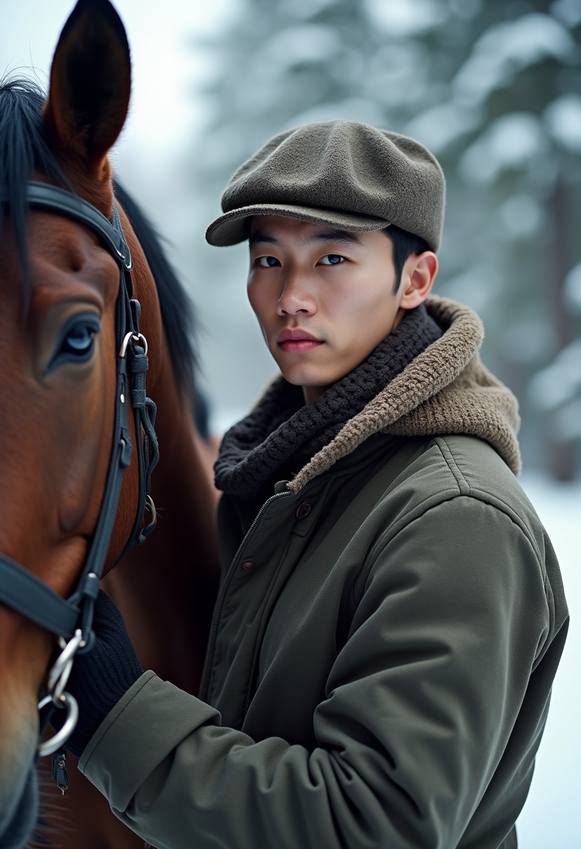 Жылы күртеше мен бас киім киген ер адам аттың шылбырын ұстап тұр, артында қарлы орман мен жұмсақ қысқы жарық.