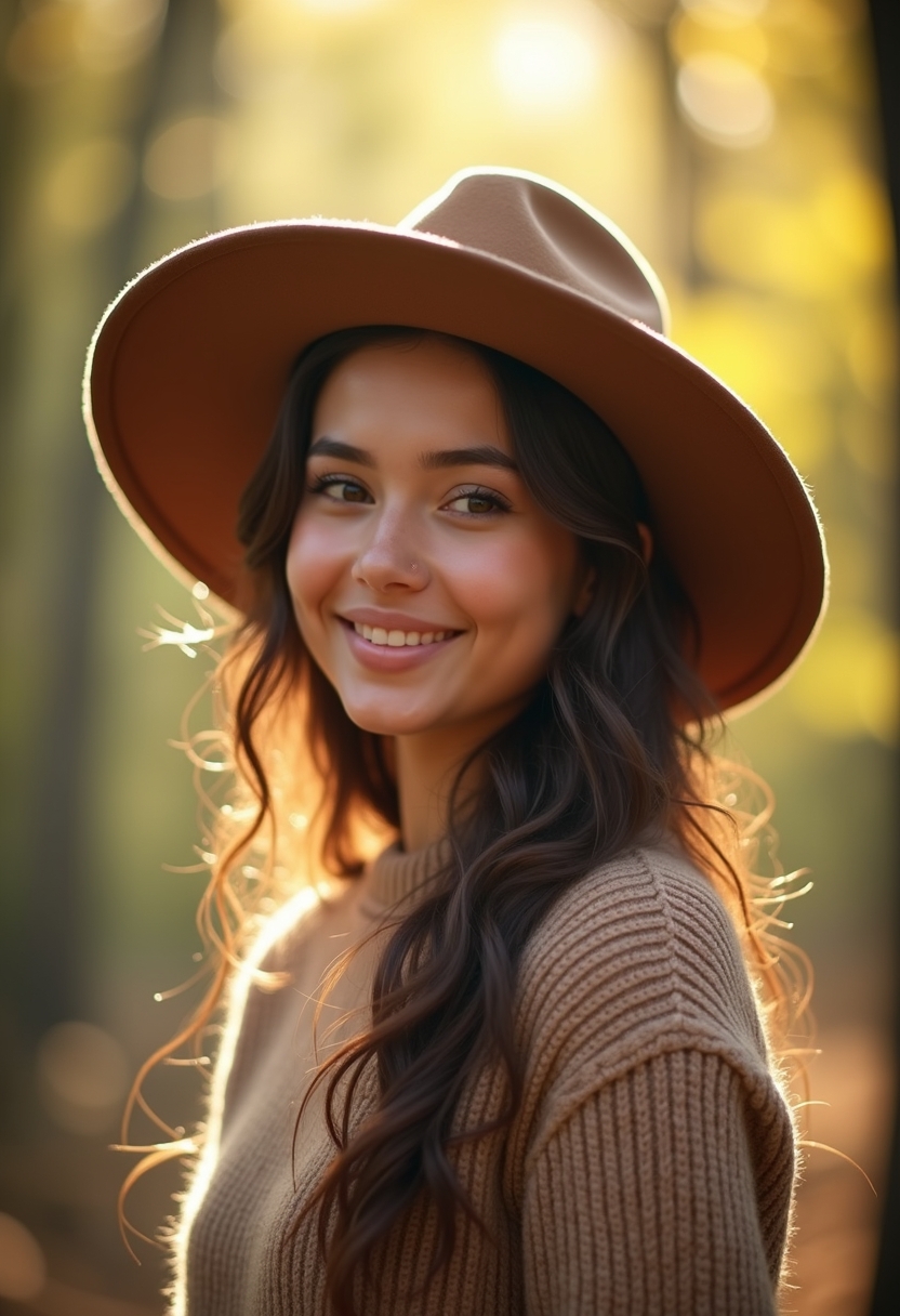 Жылы тондарда айқын полароид стиліндегі фотосессия: Орманда күн көзі сығылысқан жерде, жас әйел жемпір мен кең шляпа киіп, камераға қарап күліп тұр. Жапырақтардың арасынан түскен жарық оның бетіне жұмсақ көлеңке түсіруде. Оның көңілді көзқарасы композицияға жылы және табиғи атмосфера береді.